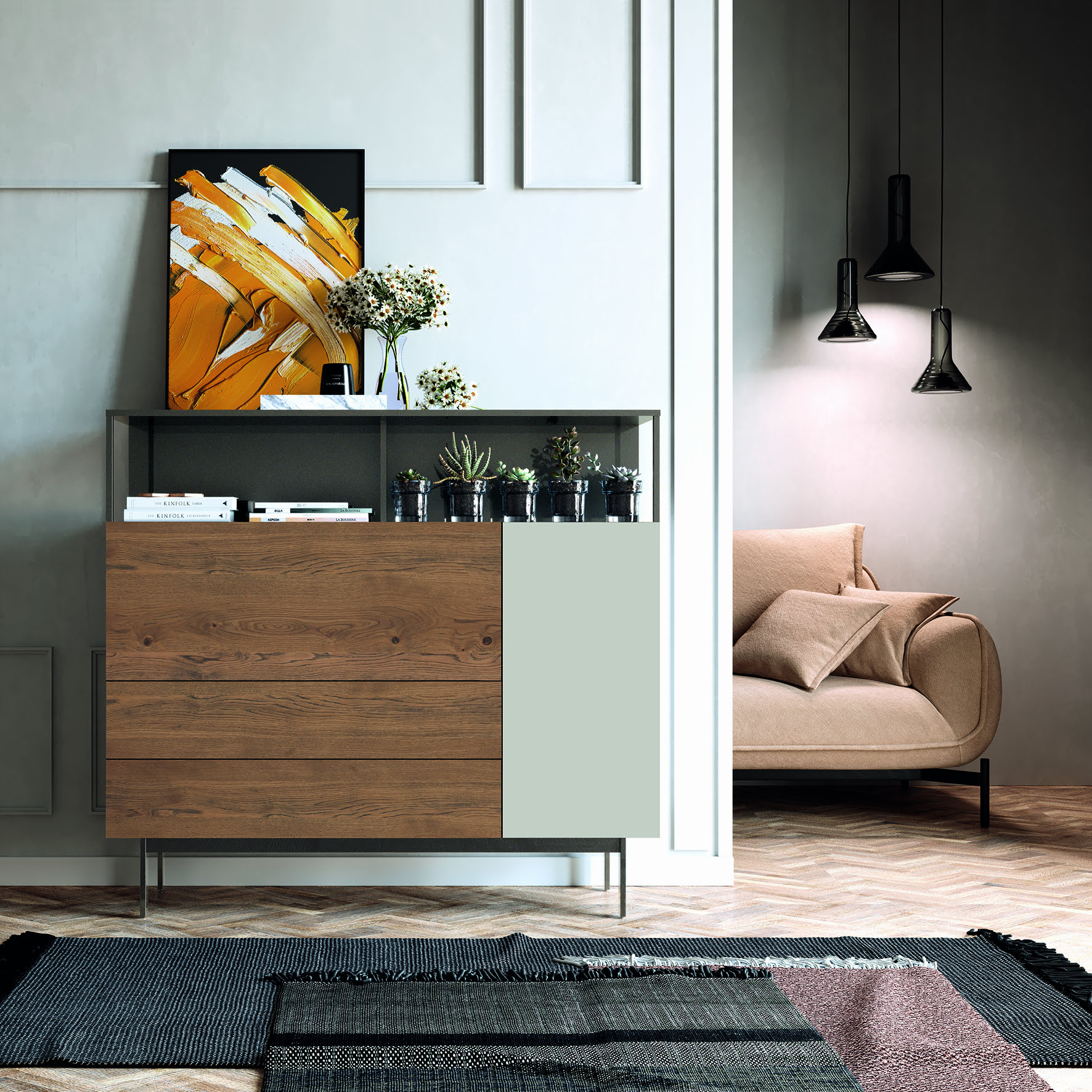 Buffet formado por Piedra Mate, Roble Vintage-Humo y Atracita Metalizado.