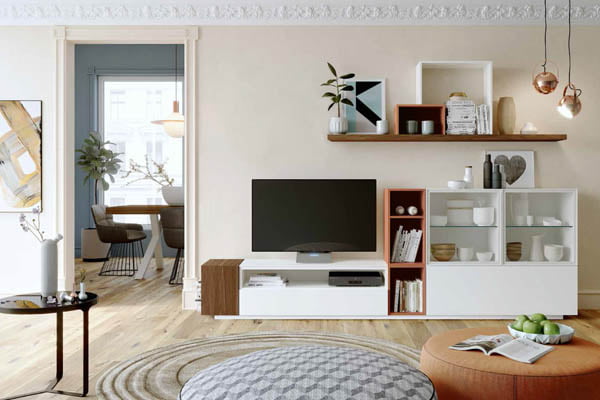 Nogal Nature con toques de Calabaza. El Blanco como base marca completamente la personalidad del ambiente. Sus líneas depuradas aportan carácter y estilo.