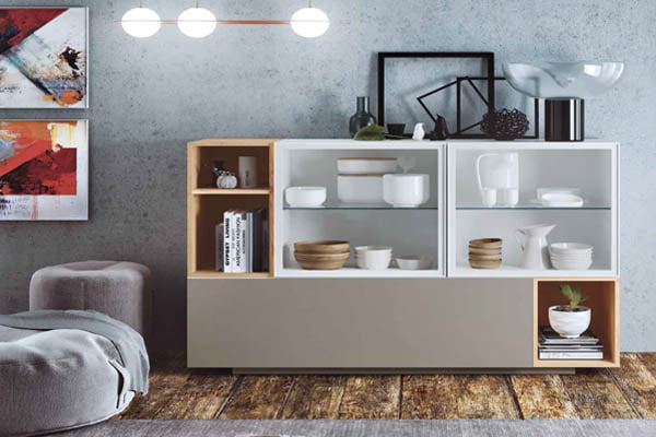 Atractivo módulo doble vitrina que combina puertas de cristal y cajones vistos, con un práctico y amplio contenedor en la parte inferior.