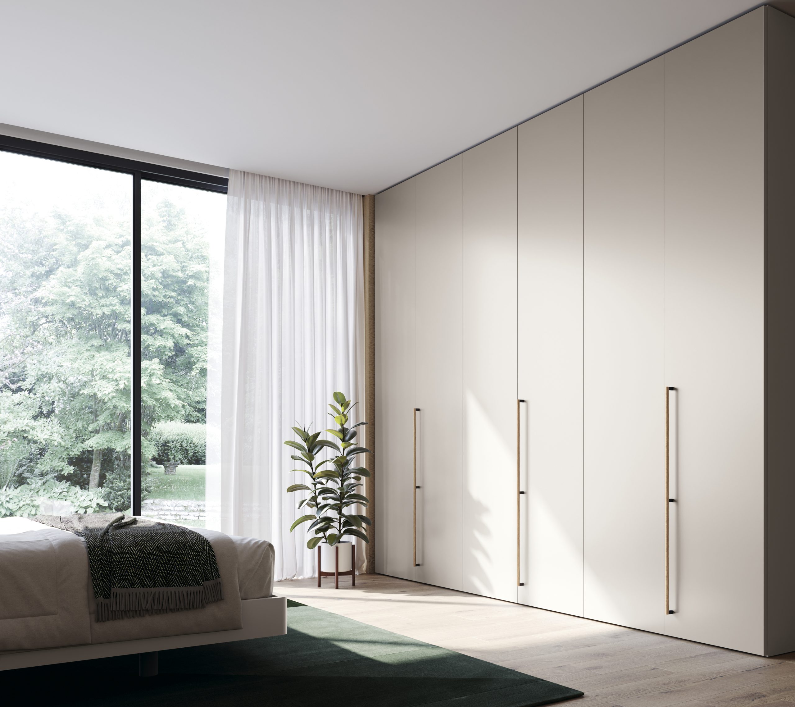 El armario MS015, con seis puertas batientes modelo Zero, se presenta en un elegante acabado laca Piedra Mate. Los tiradores Epsilon, en madera de Roble Liso, aportan un toque cálido y natural al diseño.