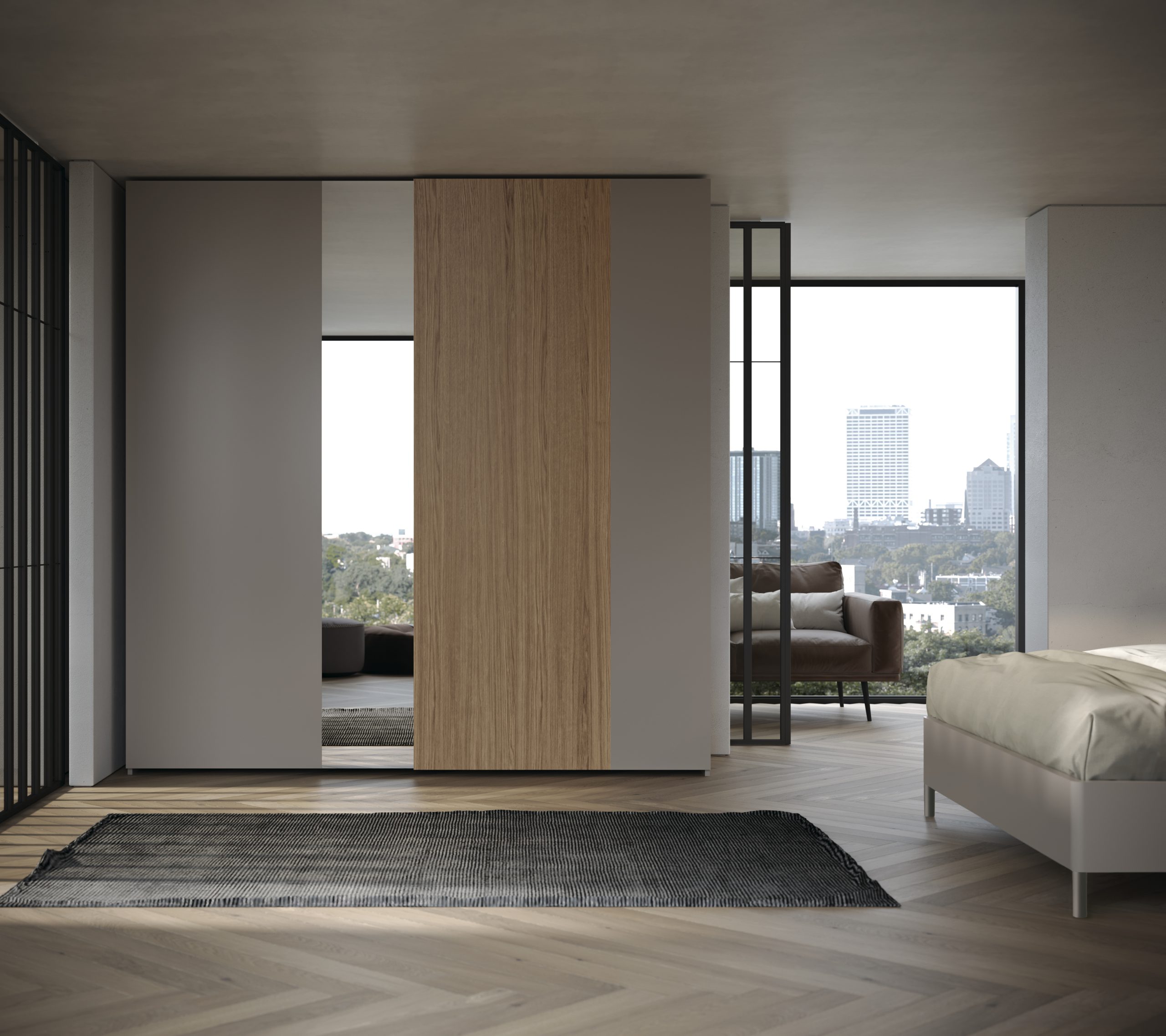 El armario MS022, con puertas correderas colgadas modelo Duo, combina acabados en Gris Londra Mate, Roble Tostado y Cristal Espejo. Una solución moderna que une funcionalidad y diseño de vanguardia.