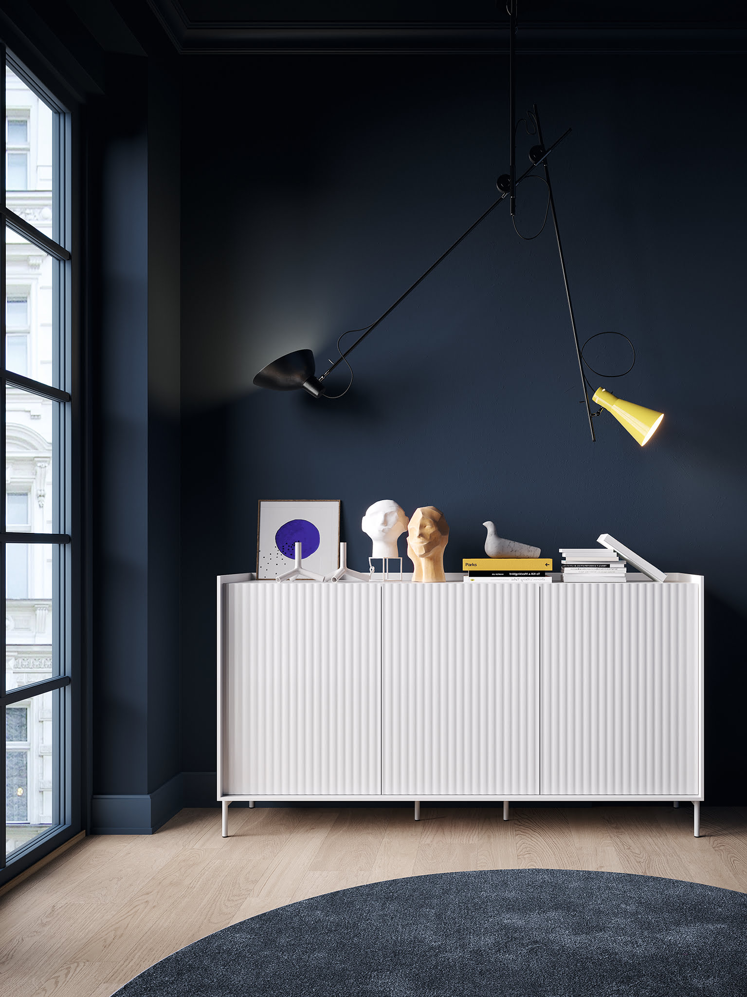 Atractivo Buffet Soho de 3 puertas listonadas en laca blanco mate. Presentado con pata metálica lacada a color. Perfecto para lograr un ambiente delicado pero atrevido.