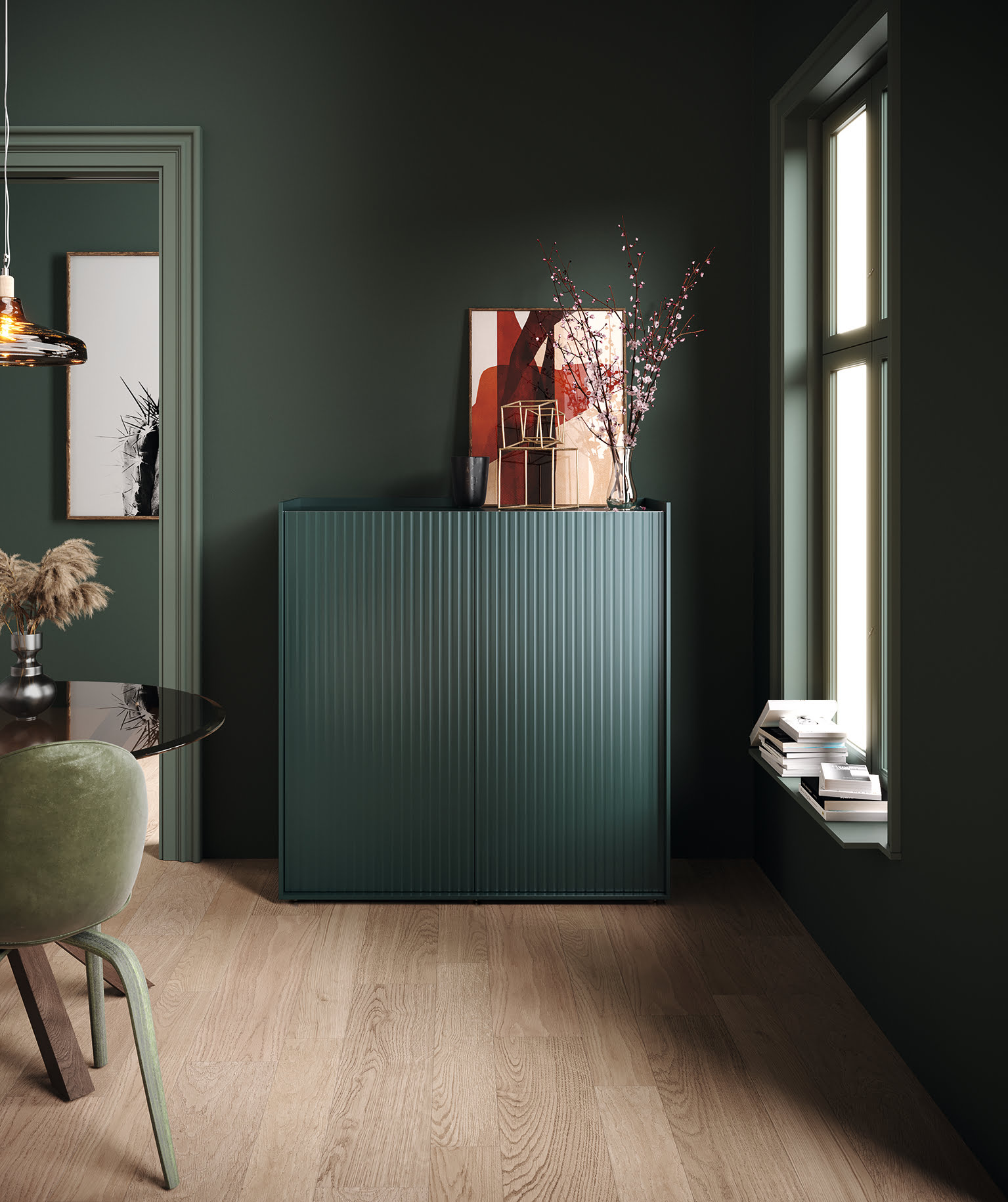 Precioso mueble auxiliar Soho con 2 puertas alistonadas. Acabado lacado en tono verde comodoro que proporciona elegancia a tu espacio. Sus medidas de 123 x 127 cm. Le otorgan una gran capacidad.