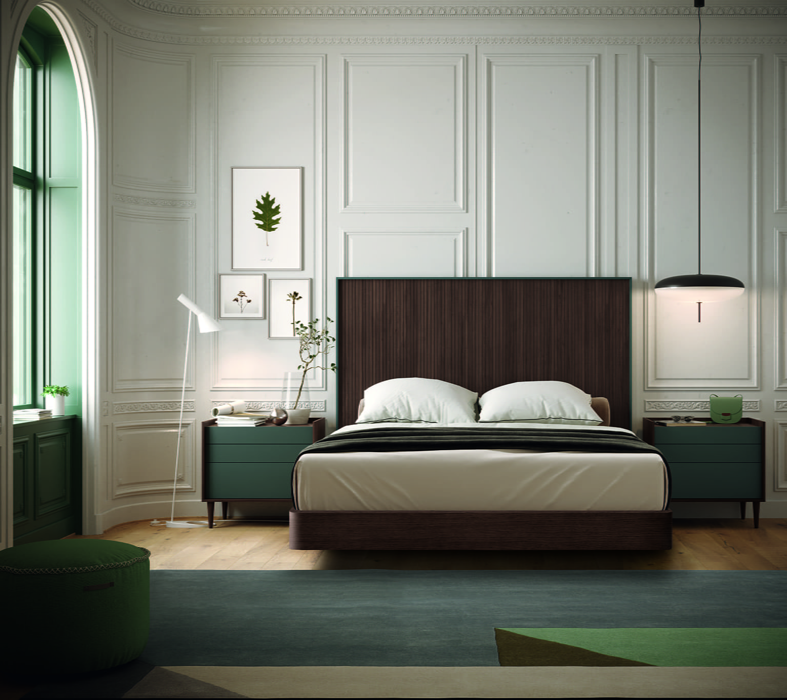 Propuesta de dormitorio en roble carbón y enmarcado en uno de los lacados mas de moda: el verde comodoro. Las mesillas de noche fabricadas en estructura y patas cónicas en roble carbón y frentes en la misma laca verde comodoro.